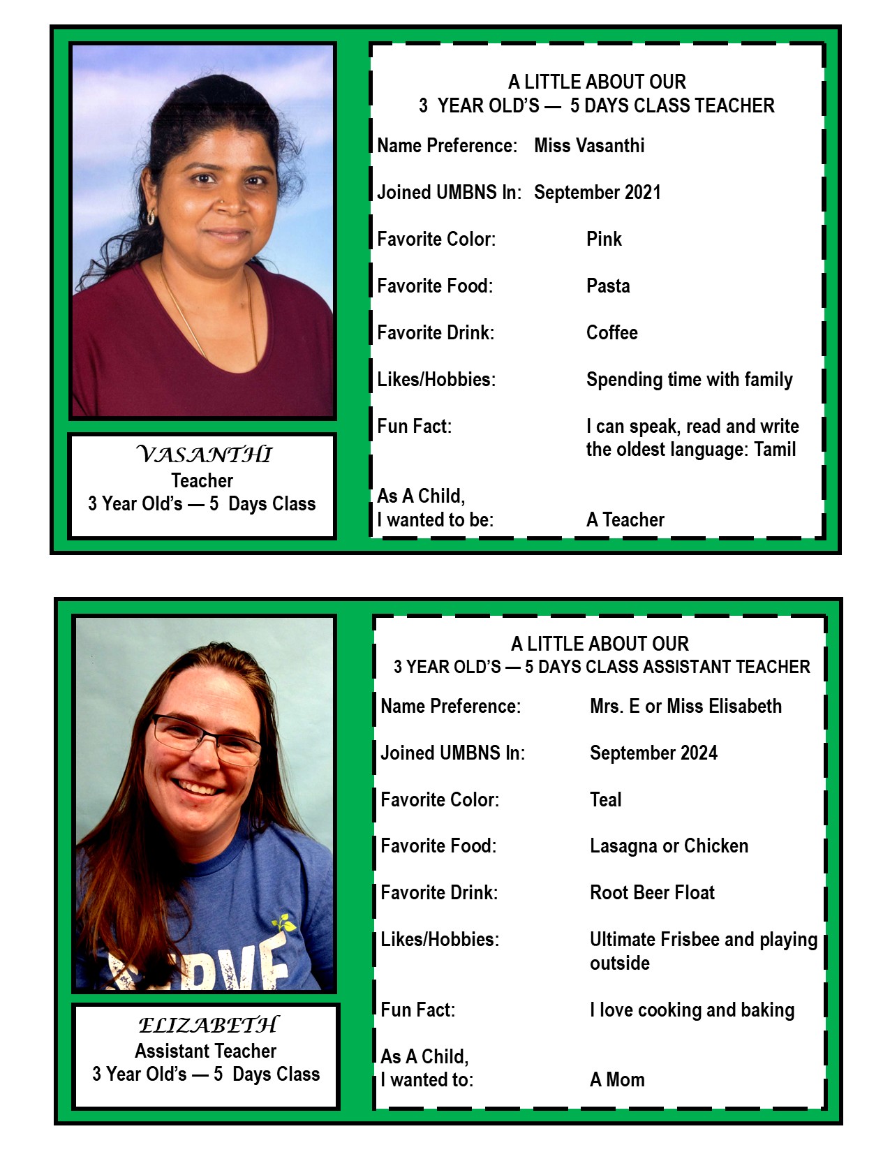 Our three year old program offers free play as well as a variety of structured activities such as circle time, craft, music, story time, chapel, gym time and outside play. We work on cognitive skills such as letters, numbers, colors and shapes as well as beginning writing skills and recognizing our names in print. We do all this while having fun and learning how to cooperate and get along with our peers.
